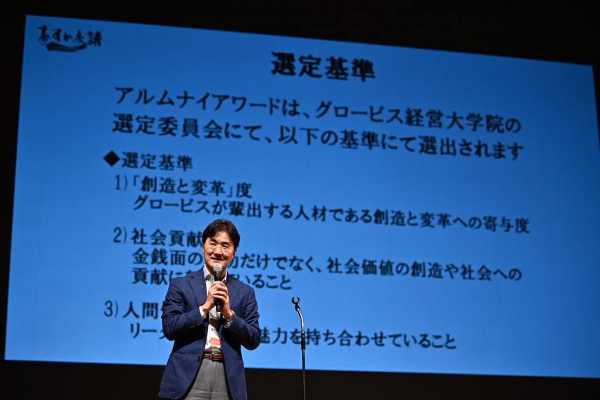 グロービスの卒業生は連日メディアに取り上げられ、多方面で多くの卒業生が活躍をしています。その中でも、ベンチャー起業や新規事業の立ち上げなどの「創造」、既存組織の再生といった「変革」を率いた卒業生を、その活躍内容が純粋なビジネスとしての価値だけではなく社会価値の向上に資するものであるか、またそのリーダーが高い人間的魅力を備えているか、といった点を重視してアルムナイアワードを選出し表彰しています。