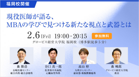 グロービス経営大学院には、MBAを学ぶ医師の方がたくさんいらっしゃいます。医師としてなぜその道を極めるだけでなく、ビジネスを学ぶという新たな一歩を踏み出したのか。「現役医師が語る、MBAの学びで見つける新たな視点と武器とは」と題し、在校生のそれぞれ立場の違う医師3名をお招きしパネルディスカッション形式でセミナーを開催します。
