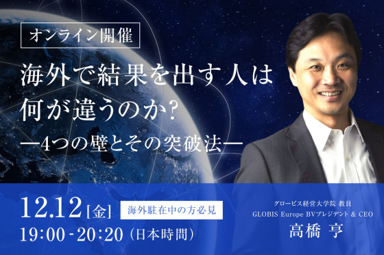 本セミナーでは、グローバル領域の科目を担当する教員・高橋の著書『海外で結果を出す人は、「異文化」を言い訳にしない』をベースに、海外駐在者が直面する「4つの壁」と、その突破法を解説します。
