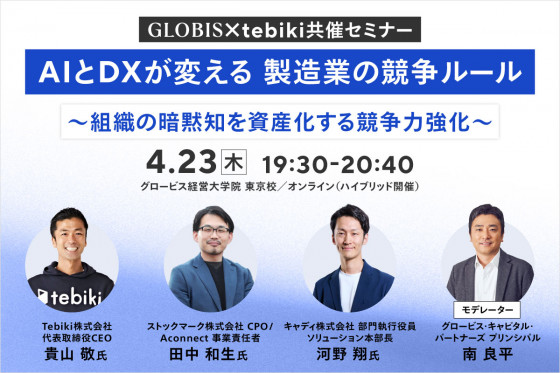 そこで本イベントでは、現場に眠る暗黙知の可視化を推進するTebiki株式会社 / キャディ株式会社 /ストックマーク株式会社の3社と、数々の組織変革を支援してきたグロービス経営大学院が集まり、暗黙知の形式知化を通じた組織の資産化、競争力へと昇華させるためのロードマップを考えます。