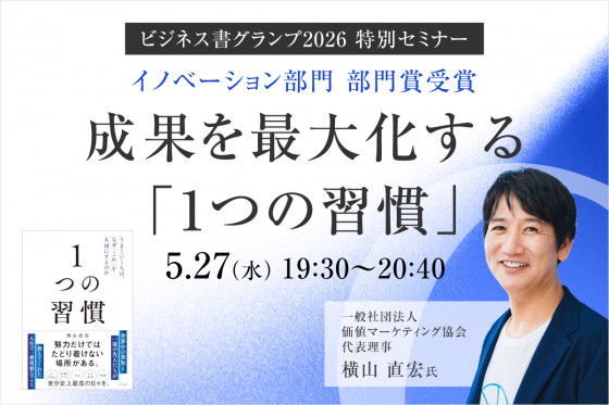 「読者が選ぶビジネス書グランプリ2026」にてイノベーション部門賞を受賞した話題作『1つの習慣』(すばる舎)の著者である横山直宏氏をお招きした特別セミナーを開催します。