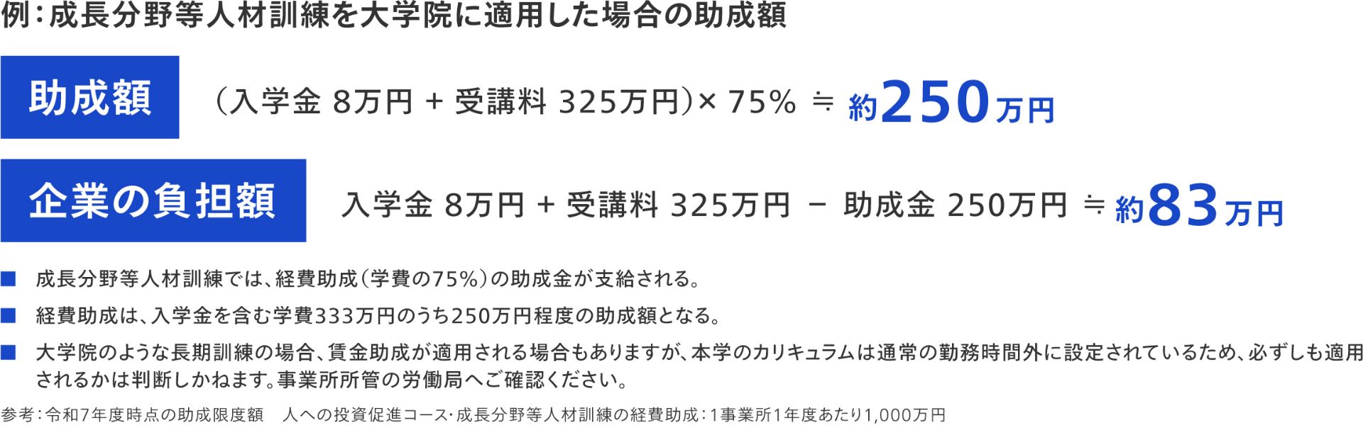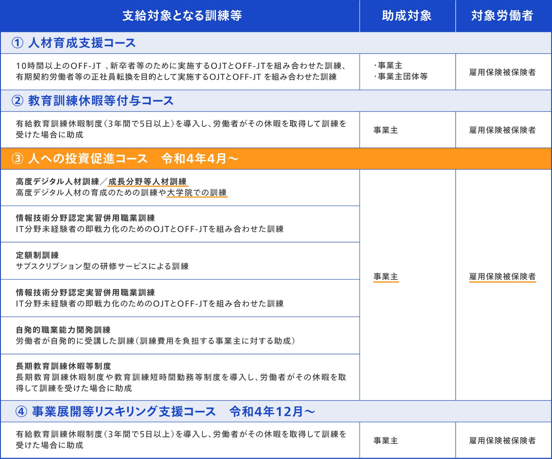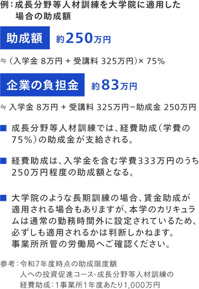 本助成金は4つのコースに大別され、このうち、本学が提供するMBA課程は「人への投資促進コース(成長分野等人材訓練)」に該当します。