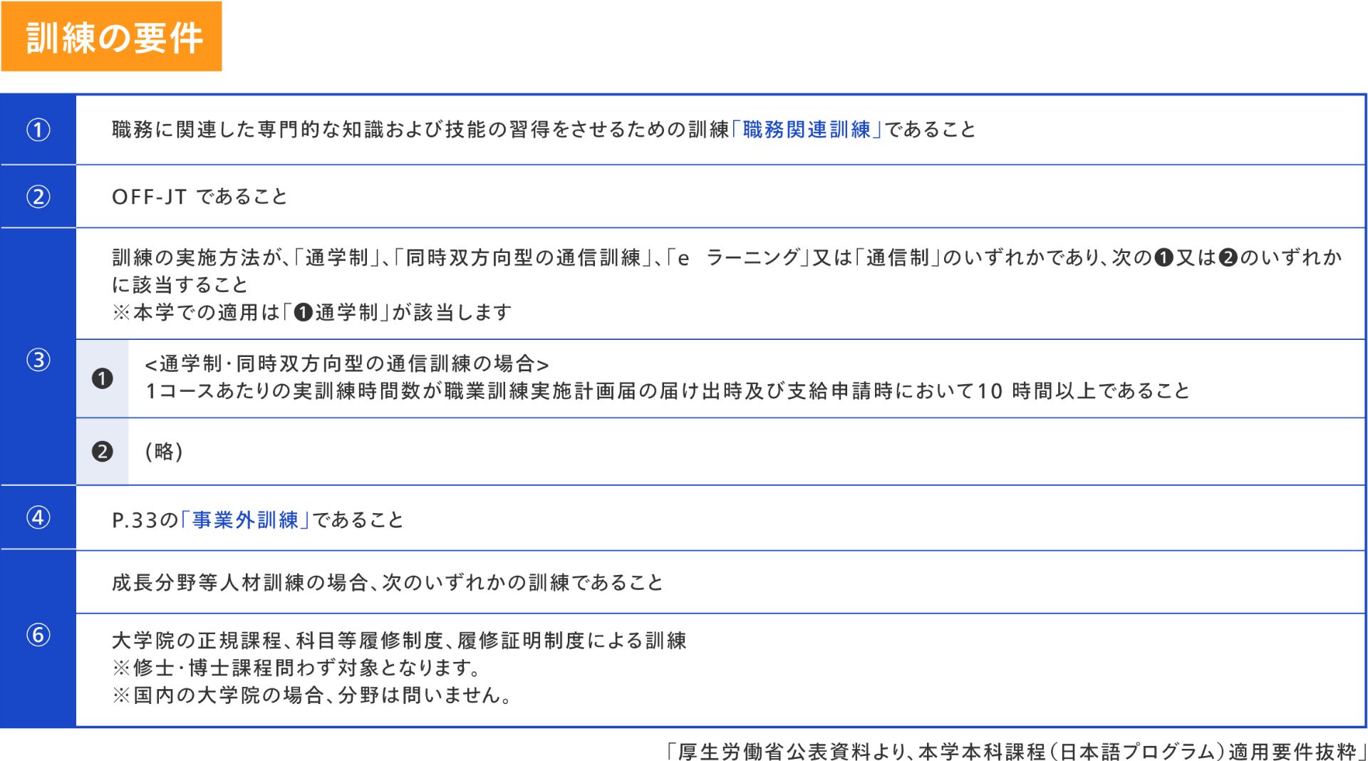 本学は下位に記載の「訓練の要件」のうち、『職務に関連した専門的な知識および技能の習得をさせるための訓練「職務関連訓練」であること』を除くその他の必要な要件を満たしています。