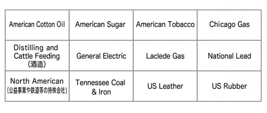 当初の12銘柄は以下の通りで、タバコ、綿花や鉱業など、19世紀末当時、取引が活発だった産業がうかがえます(銀行や保険会社等は、当時上場していませんでした)。