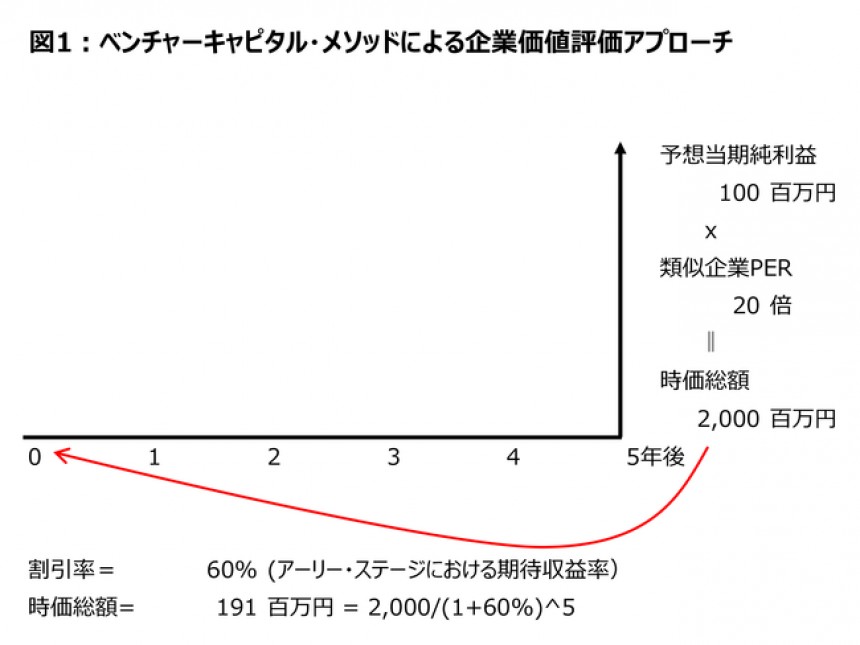 ベンチャー企業の株価を算定する方法として、「ベンチャーキャピタル・メソッド」という手法がある。設立したての企業や、設立後間もない企業は往々にしてその損益は赤字である。しかし、数年後には事業が軌道に乗り、利益が出てくることを確信して、起業家は事業を起こす。このような企業に投資する投資家(ベンチャーキャピタリスト)は、投資先企業が将来利益を出すことを前提として、その将来時点での利益に同業他社の平均PER(株価は1株当たり利益の何倍かを表す指標)をかけたものを、その時点での時価総額とし、この時価総額を投資時点の現在の価値に割り戻す。割り戻す際には、事業リスクのほかにその企業が生存して利益を出すかどうかの不確実性を加味した、かなり高い割引率(期待収益率)を適用する。