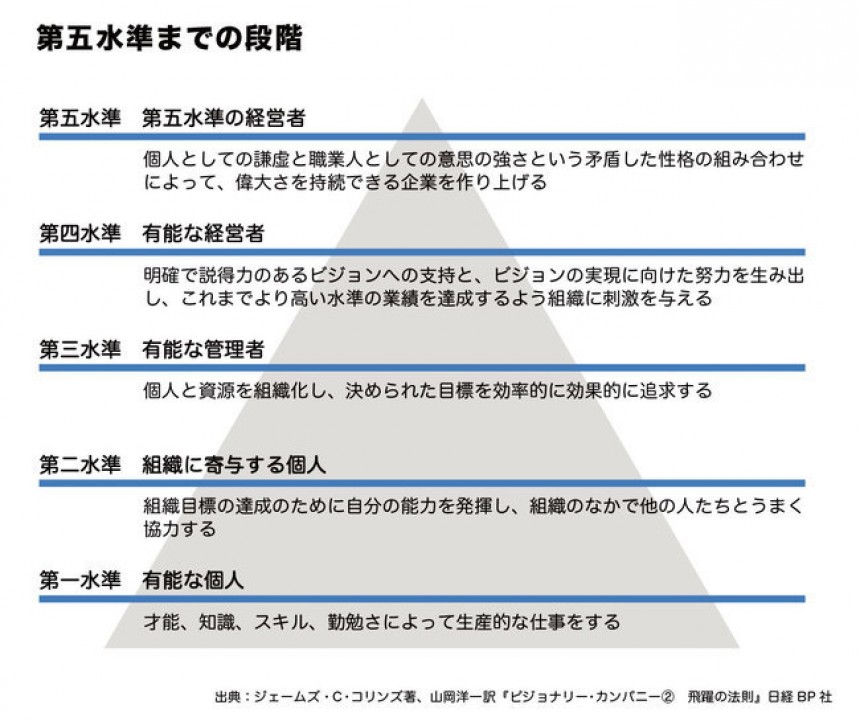 ジェームズ・コリンズらの調査によると、よい企業を偉大な企業に飛躍させた経営者は全員、同じ性格を持っていることがわかりました。それが、「第五水準」すなわち、謙虚さと不屈の精神を併せ持ったリーダーシップです(図参照)。第五水準の経営者は驚くほど謙虚であり、控えめで飾りません。成功したときは自分以外に成功要因を見つけ、結果が悪かったときは自分に責任があると考えます。謙虚さを装っているのではありません。周囲からも無口、内気、丁寧、穏やか、目立たない、飾らないと評されています。
