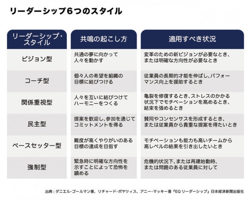 さらにゴールマンは、組織に共鳴を起こすリーダーシップ・スタイルを6つに分類しました。優れたリーダーは、TPOに応じて、これら6つのスタイルを使い分けているのです。