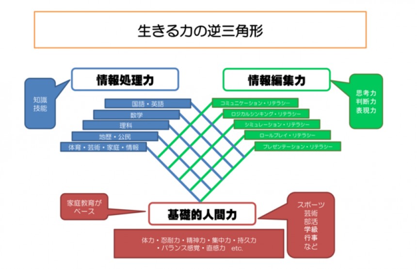 まず、逆三角形の1番下は基礎的人間力ですね。これ、「体力」「忍耐力」「精神力」「集中力」「持久力」等々書いてありますが、基本は皆さんが家庭生活で、あるいは幼いときの家庭教育や環境またはコミュニティで学んできたことです。中学高校だと部活で鍛えたりしてね。ちょっと鍛え過ぎちゃった日大みたいのもありますが(会場笑)、とにかく基礎的な人間力がベースです。