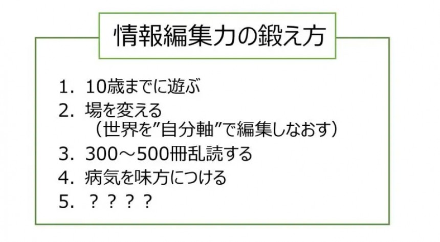 はい、ここまでざっと、情報編集力をどう高めるかということをやってきましたが、情報編集力については「10歳までにどれほど遊んだかがベースになるっていうのはよくわかりました。だけど、大人になってからどういう風に鍛えればいいんですか?」っていう質問をよく受けます。遊びのほかには、留学、あるいは場を変えるというのもあります。場所を変えると、もう一度「自分軸」から世界を編集しなきゃならないので、その負荷がかかります。つまり負荷をかけなきゃダメなんですよね。