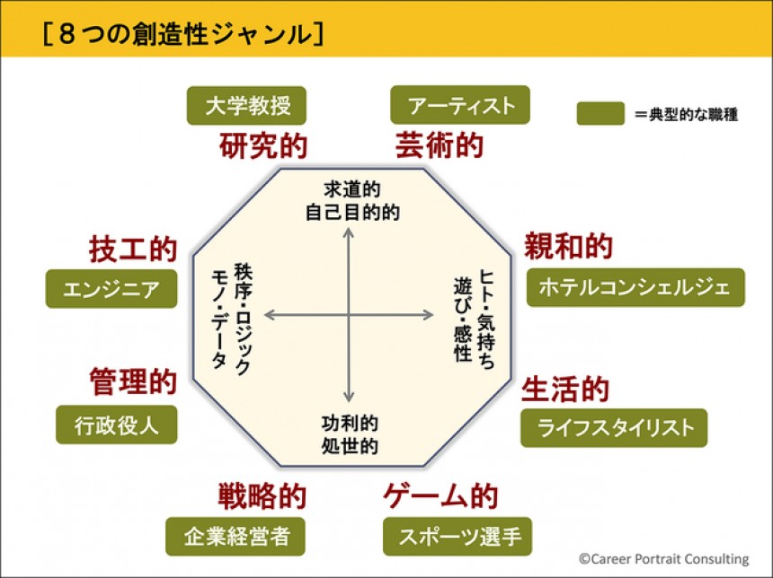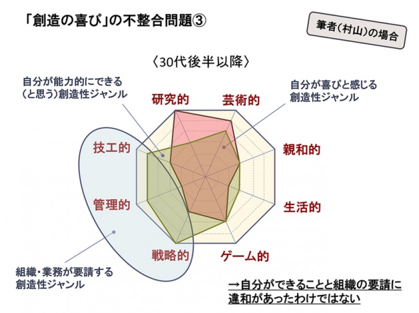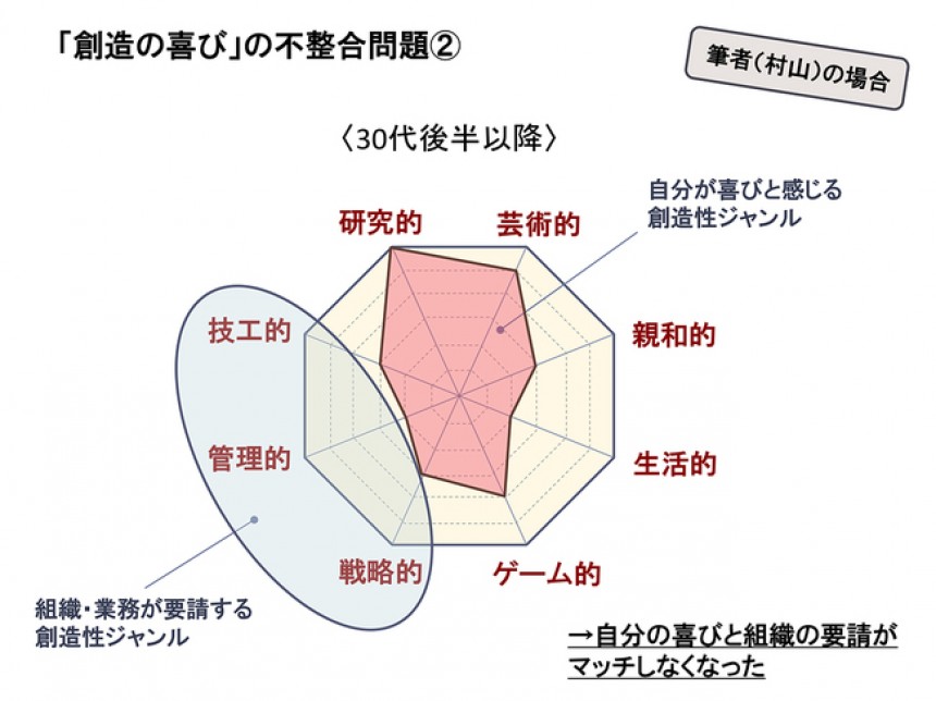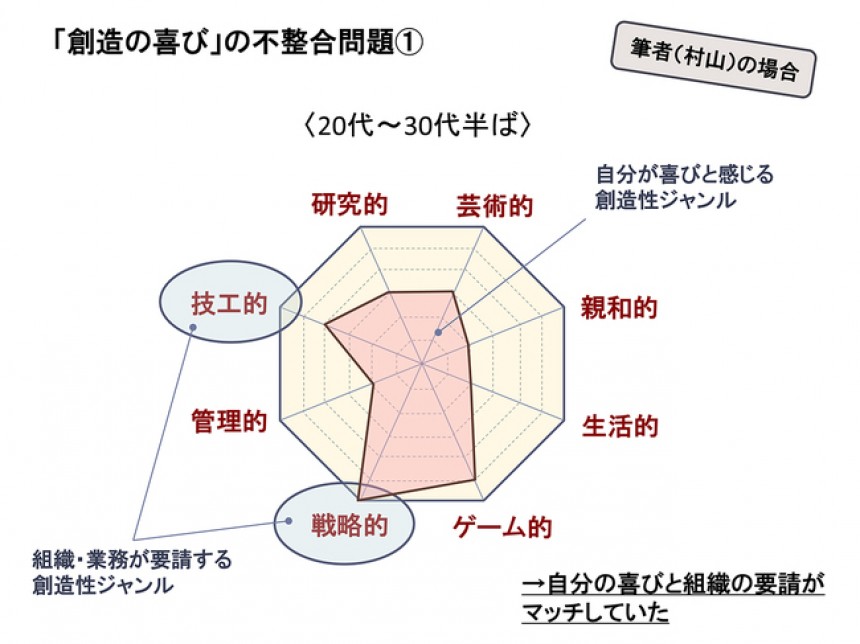 私が20代~30代半ばのころ、自分が喜びと感じる創造性ジャンルは主に「戦略的」「ゲーム的」「技工的」でした。メーカーで商品開発や出版社でコンテンツ開発の業務に携わり、まさにどう商品を戦略的に練って競合他社に勝っていくか、また、遊び感覚を取り入れた発想でどう奇抜なアイデアを起こすか、そしてそれを最新の技術でどう効果的に仕上げていくか、日々の業務はそうした創造性を楽しみながらやれるものでした。そして当然、組織が私に求める創造性も「戦略的」「技工的」なもので、双方はうまくマッチしていました(下図)。