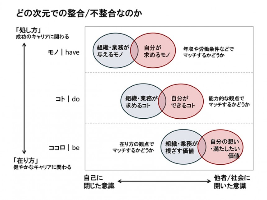 このように、仕事と自己のマッチング問題には次元があります。1つには、年収や労働条件など外形的なものがマッチするかどうかという「モノ」次元。もう1つは、能力的な観点でマッチするかどうかという「コト」次元。これらの次元でうまく整合性を獲得していくことは、「成功のキャリア」に通じています。