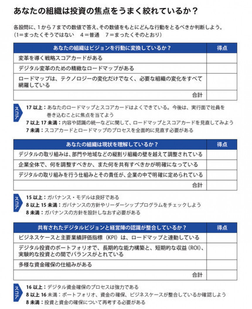 各ステップで、デジタルマスターのレベルに達するためには何点が必要かを示した。また、今すぐ行動にとりかかって、状況を改善すべきと判断できる点数も示した。もし、あなたの組織の点数がデジタルマスターの範囲内であれば、次のステップに進んでよい。もし点数が中程度の範囲にある場合は、その理由についてよく考えよう。投資の焦点を絞る段階で、まだ取り組まなければならないことがいくつかあるはずだ。もし点数がそれよりも低いのであれば、今こそ是正措置を取らなければならない。点数がかなり低いのであれば、今すぐデジタル変革のための投資プロセスについて、根本的に再考することをお勧めする。