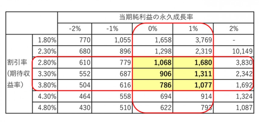 標準的な当期純利益率である7.5%を基準とし、「割引率(期待収益率)」そして「当期純利益の永久成長率」で事業価値をシミュレーションしたものが、下記の表である。