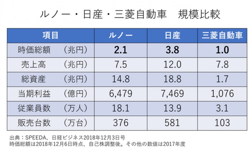 ルノーと日産、さらには日産が34%を保有している三菱自動車の時価総額その他の規模を比較したのが下記の表です。
