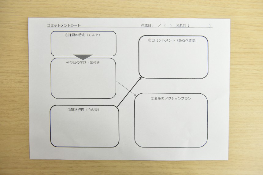 参加者の手もとに配られているのは、「①現状把握」「②コミットメント(あるべき姿)」「③課題の特定」「④今日の学び・気づき」「⑤変革のアクションプラン」を記入できるコミットメントシート。ただ座って話を聞いているだけではなく、どのように明日から行動変容に繋げていくのか、参加者にも考えてもらうところがこのイベントのユニークさだ。