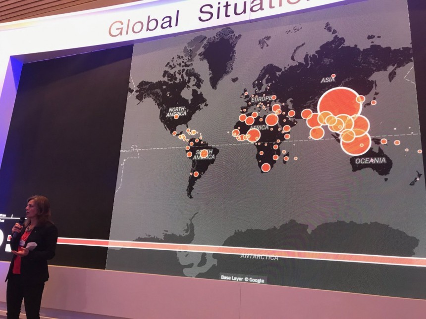 海洋環境のセッションの2人目のスピーカーは、不法漁業問題を説明している。この図は、グーグルが衛星写真のデータを使って開発した漁船の操業地域だ。このデータをAIで解析をすると誰がどこでどの魚を取っているかがわかり、不法漁獲問題を解決できるという。テクノロジーが解決できる問題も多い。
