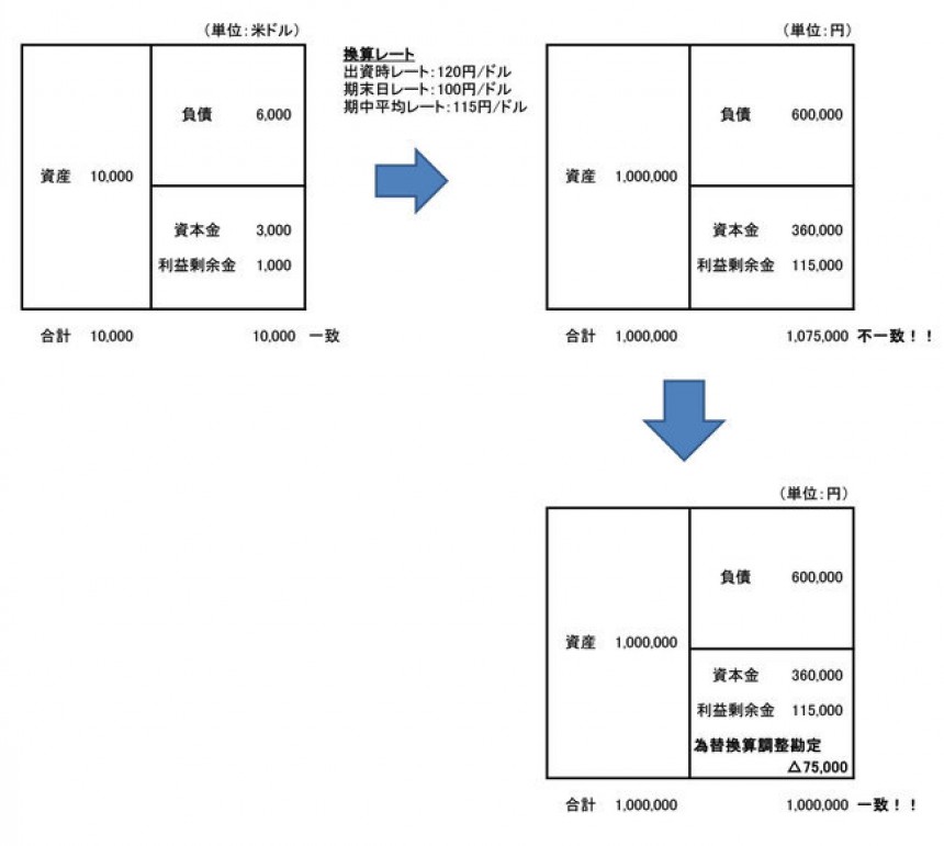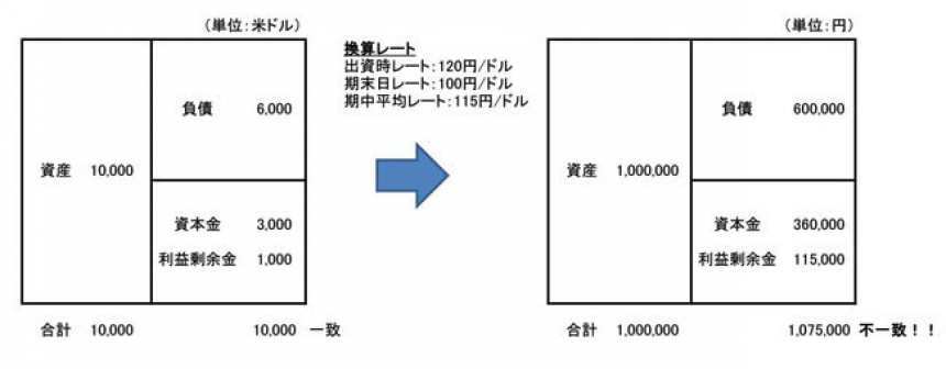 簡単な例を見てみましょう。当期設立された米国子会社の1期目の決算(B/S、P/L)を円換算します。為替レートは、出資時レート:120円/ドル、期末日レート:100円/ドル、期中平均レート:115円/ドルとします。資産と負債は期末日レート(100円/ドル)、利益剰余金は期中平均レート(115円/ドル)、資本金は出資時レート(120円/ドル)で円換算します。その結果、円ベースではB/Sの左右の金額が一致しなくなります。