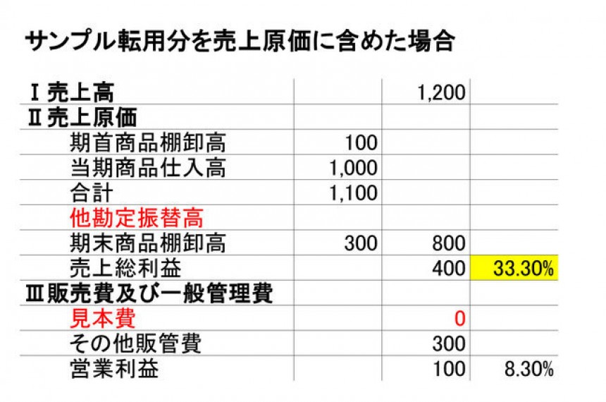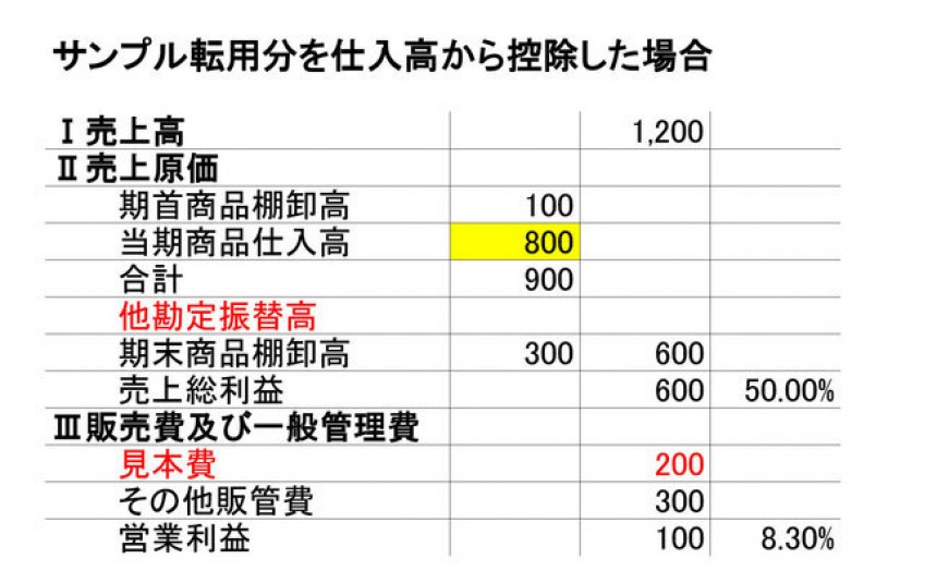 そこで、販売(PLでは売上原価となります)の「他」の理由による商品の減少分については、他勘定振替高という勘定科目を使って売上原価から控除します。なお、災害等の異常な要因により商品等が消失した場合にも同様に、他勘定振替高を使って売上原価から控除します。この場合は、特別損失(災害損失等)で処理することが考えられます。