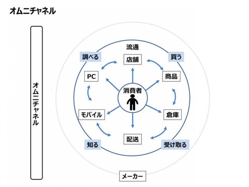 インターネットが普及する以前の買い物は、直接店舗に出向いてするのが中心で、流通チャネルも地域の小売店しか選べない、1対1対応のシングルチャネルだった。しかし、ネット通販が一般的になってくると、実店舗に加えてインターネット、テレビなどが加わるマルチチャネルへと買い物環境が変化した。さらに、マルチチャネルのサプライチェーンを統合して在庫管理を一元化しながら、インターネットで注文した商品を実店舗で受け取る、という複数のチャネルをまたがるクロスチャネルも形成されていった。