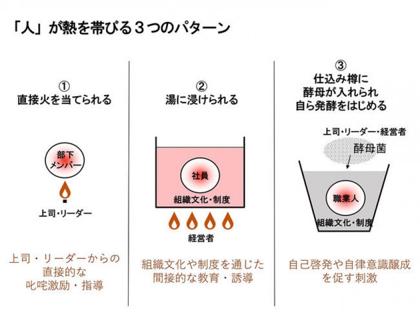 そして3番目の発酵型。これが最も難しいものですが、最も根本的で強力な熱の帯び方になります。上司やリーダー・経営者は、一人ひとりの社員の内にある自己啓発性をうまく刺激し、自律意識醸成の手助けをします。この3番目の発酵型は、一人ひとりの社員の内発的動機を呼び起こし、自ら発熱させ、自らの変化を促すものです。そして「個として立つ職業人」に育てていくものです。
