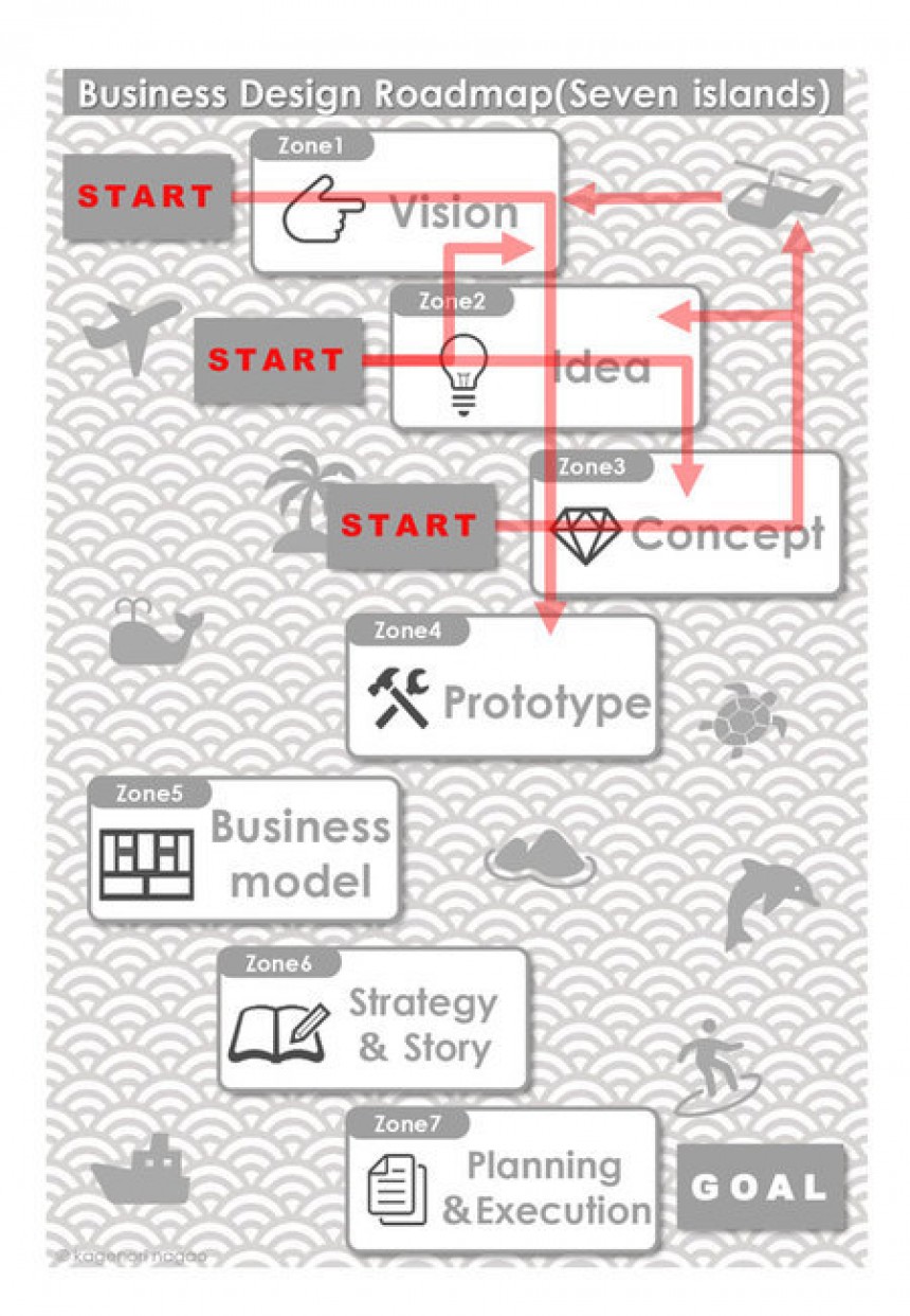 ビジネスデザインロードマップを使う目的は、「アイデアをアイデアのまま終わらせずビジネスとして成立する形に仕上げること」にあります。直感は説明しにくく、論理は説明しやすい。直感としてのアイデアだけで突き進むのではなく、直感を論理的に説明することがビジネスとして成立させる要件でもあります。論理を組み立てるために、ロードマップの各ゾーンを踏んでおく必要があるのです。特にコンセプトゾーンまでは順番を意識しすぎることなく、各ゾーンをしっかり検討し自信を持って話せるように、時間をかけて行き来(議論)をすることをお奨めします。確固としたコンセプトが出来上がると、その先の視界が一気に拓けます。以降のステップであるプロトタイプやビジネスモデル、戦略やストーリーを考えるフェーズでやるべきことは自ずと見えてきます。