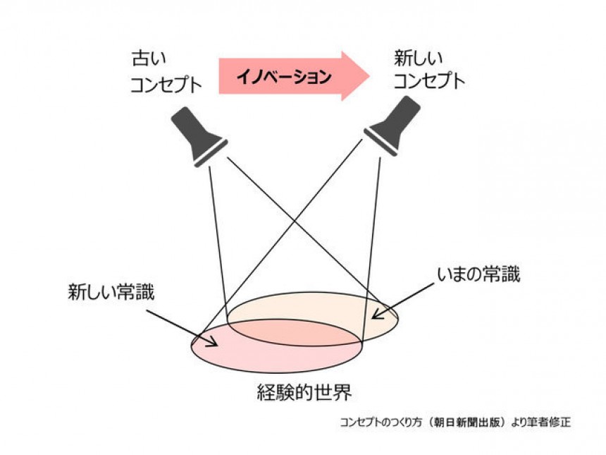 2つめは、「新たな常識をつくるためのサーチライトを照らす」という考え方です。いま、「正解」と言われていることは「いまの常識」でしかありません。これから創る新たなビジネスは正解(いまの常識)を追い求めていても創造できません。つまり、これまで「常識=正解」として照らされていたサーチライトをずらし、新たな常識部分を照らし、新たな正解領域を作ることと言えます。こういった、新しい常識を追求していく活動を企業ではイノベーションと呼ぶのでしょう。こちらは、『コンセプトのつくり方』という書籍の書評を書いているので詳細は譲ります。