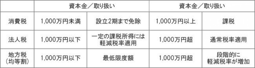 一方で、税務面では資本金は小さい方が有利な点があります。例えば、資本金の大きさによって以下のような税制上の取り扱いの違いがあります。