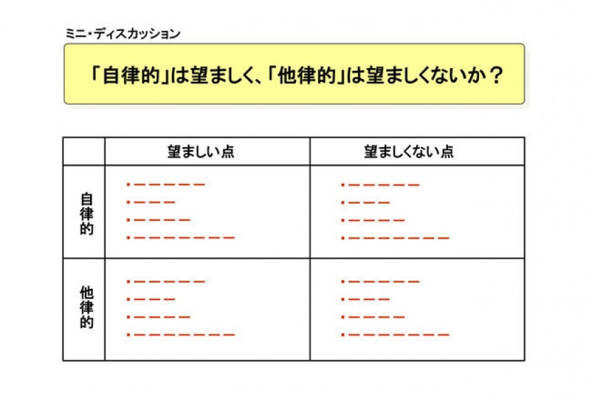 この4象限の空欄にどんなことが当てはまるか。だれしも「自律的×望ましい点」と「他律的×望ましくない点」はすぐに思い浮かべることができます。しかし、じっくり考えると、「自律的×望ましくない点」や「他律的×望ましい点」についてもいくつか出てくるでしょう。