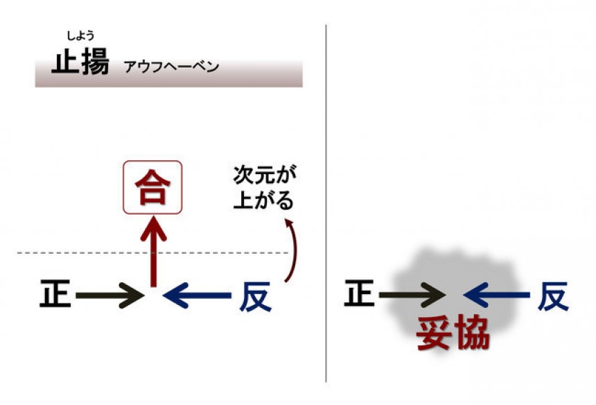 ただし、「正」と「反」がぶつかりあっても、妥協で済ませる場合は「合」ではありません。「合」とは次元が上がって生み出された新しい何かです。
