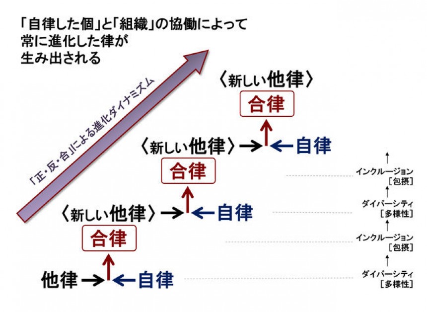 この自律(正)×他律(反)→合律(合)の進化は、観点を変えれば、ダイバーシティ(多様性)とインクルージョン(包摂)のダイナミズムといってもいいでしょう。あなたが所属する事業組織には、個と組織の「合律的」ダイナミズムが健全に起こっているでしょうか。