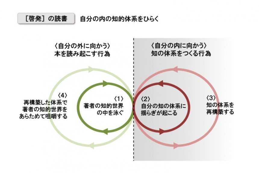 私たちは、まず本を開いて文章を読んでいきます。最初はそうして〈1〉著者の知的世界の中を泳ぐわけです。そうするうち、著者の伝えてくる内容が自分にまったく新しかったり、既存の考え方と異なったりして、〈2〉自分の内の知の体系に揺らぎが起こる。