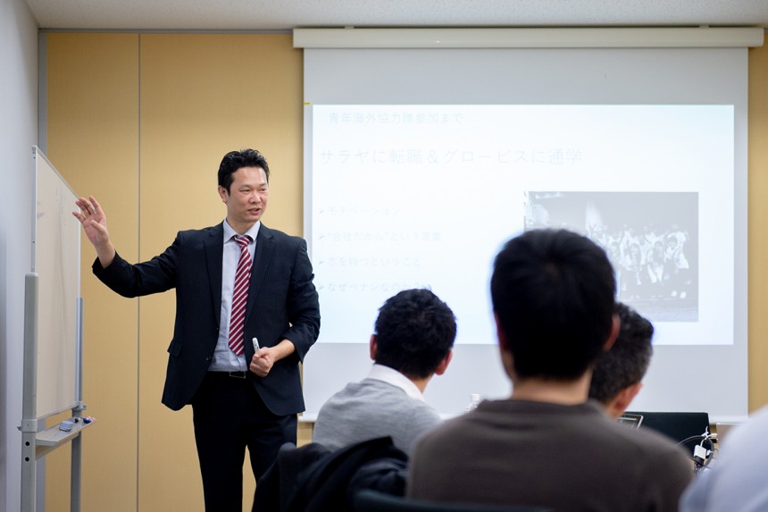 「今から10年後、グロービスでの生活を振り返った時に思い出すのは勉強のことだけでしょうか?仕事を抱えながらがんばって勉強していたこと、転職活動しながら勉学で大変だったこと、家族の協力がありがたかったことなど、勉強+αのなにかを一緒に思い出すと思います。+αを自主的に見つけたいという人には、クラブ活動への入会をお勧めします。クラブ活動には、授業での学びを広げたり、授業にはない交流を深めたりする+αがあるからです。そしてもしアフリカ部が気になるようでしたら、気軽に覗いてもらえたらと思います」