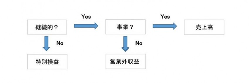 P/L上の売上高は、継続的、日常反復的に繰り返される商取引から生ずる収益です。資産の売却のような一時的、臨時的な取引による収益は売上にはなりません。例えば、会社の遊休土地を売却するような場合は臨時的な取引と考えられますので、売上高には該当せず、特別損益として処理されることになります。この場合、売却による収入額と土地の帳簿価額の差額を特別損益として計上します。