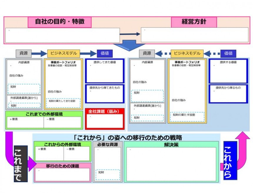 では、具体的に「経営デザインシート」を見てみましょう(上図参照)。重要なのは、右半分の自社全体や自事業の将来構想部分です。「提供価値」、それを生み出す「収益の仕組み(ビジネスモデル)」、その中で用いられる主要な「資源」を埋める形となっています。ただ、いきなりそこを構想するのは難しいので、左半分でこれまでの上記要素を挙げ、上の方の枠に企業理念や全社的な経営方針を書いていくことで、右半分を導きやすくしています。さらに、左の「これまで」と右の「これから」を比較することで、下の「移行のための戦略」も定まってくるという仕掛けです。