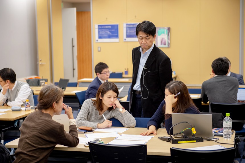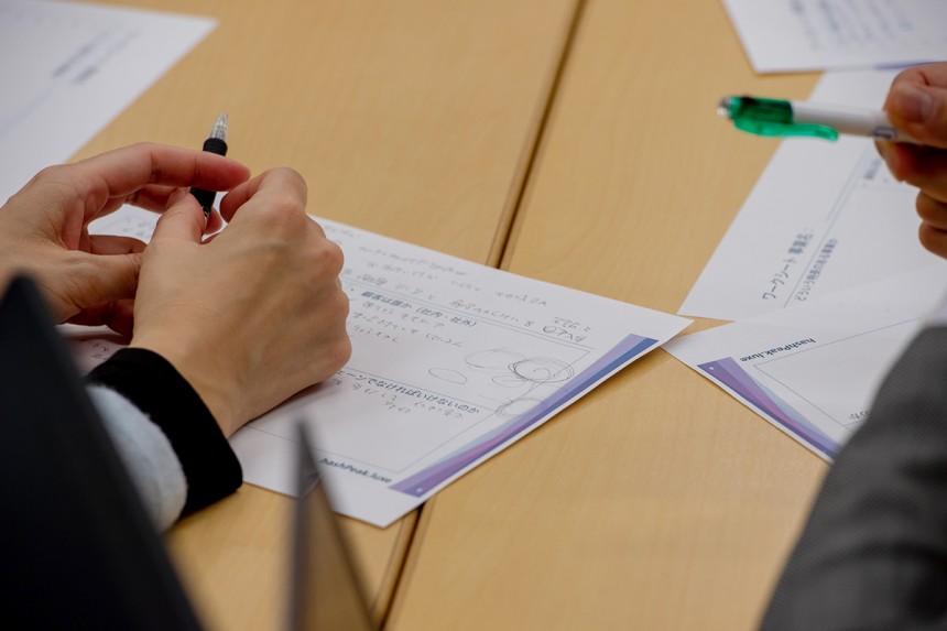 最後の約20分で、ブロックチェーンの事業活用についてチームごとにディスカッションが行われた。まずは各自で「事業の特徴」「顧客」「顧客の課題」「ブロックチェーンでなければならない理由」をワークシートに書き込み、それをもとにチームで議論を進める流れだ。