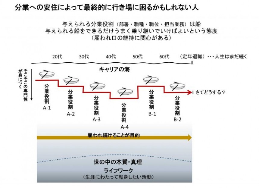 中高年になってキャリアに行き詰まる人の多くは、与えられる分業役割(部署・職種・職位・担当業務)をそつなくこなすことに自己の有能さを感じる傾向があるように思われます。分業役割という枠に自分をはめこみ、多少の専門性を身につけて成長感も得ますが、結局のところ、彼らにおいては雇われ口を確保することが主たるキャリアの関心事になっています。喩えて言えば、分業役割を船のようなものとしてとらえ、それをできるだけうまく乗り継いで定年までいけばよいという態度のように見うけられます。