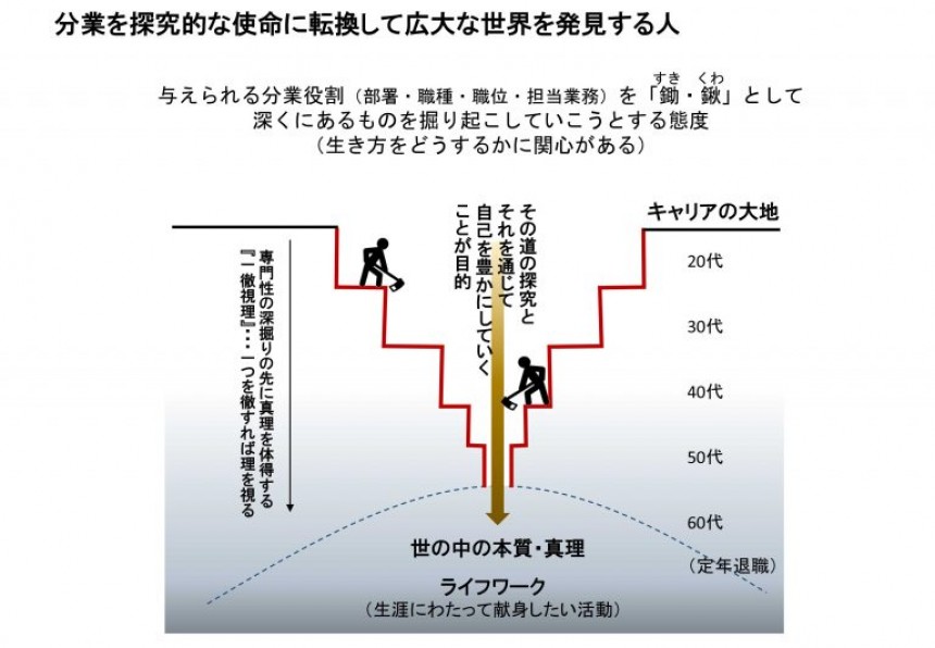 こういう人は、分業役割というものをまさに鋤(すき)・鍬(くわ)にして、深くにあるものを掘り起こしていこうという姿勢になります。たまたまの配属で任された職種であっても、その道を探究し、その分野を通じて自分の存在をふくらませていこうとする。そうこうするうちにいろいろなものが見えてきて、ライフワークを掘り当てることにもなります。中高年のステージでキャリア形成がうまく進んでいくのはこういうパターンです。