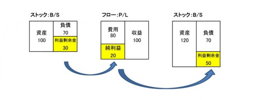 この関係をP/LとB/Sで表現すると、ストックが利益剰余金、フローが当期純利益となり、当期純利益が利益剰余金に連続的に組み込まれることになります。例えば、2019年の期首の持ち高である利益剰余金に、2019年度の当期純利益が加算されて2019年の期末(=2020年の期初)の利益剰余金になるという具合です(※1)。
