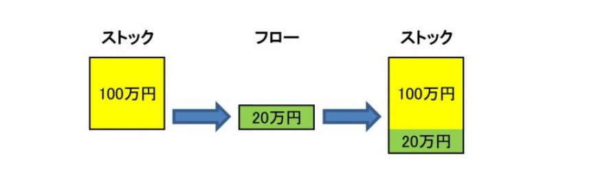 例えば、100万円を元手にビジネスを始め、初年度に20万円の儲けを得たとします。すると、手元には120万円が残ります。この時、ビジネス開始時点での元手100万円がストック、ビジネスによる儲け20万円がフローと言うわけです。そして、儲けであるフローは次年度のビジネスのための元手であるストックに加算され、ストックの一部に組み込まれるのが分かるでしょう(結果、手元資金は120万円となります)。