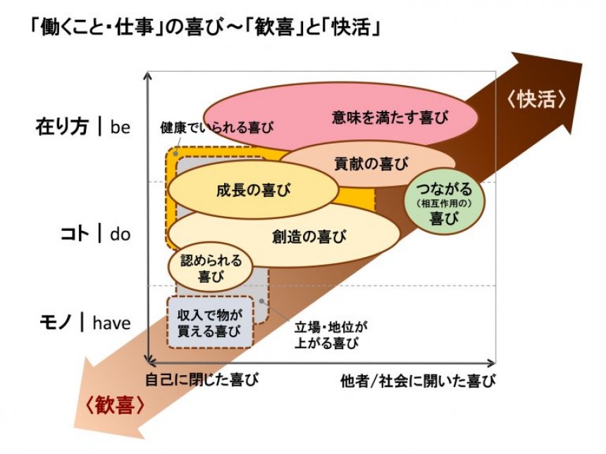 自分がいま働くことから得ている喜びが、「歓喜」寄りなのか、「快活」寄りなのか、あらためて内省してみるのは有意義なことだと思います。
