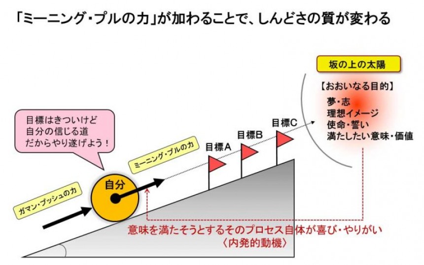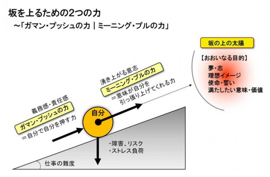 あなたは、「ガマン・プッシュの力」だけで何十年と続く仕事人生の坂を上っていく人でしょうか。それとも、坂の上の太陽からエネルギーをもらいながら「ミーニング・プルの力」を足し合わせて上っていく人でしょうか。