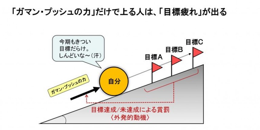 「ガマン・プッシュの力」の源泉は、外発的動機、すなわち目標の達成/未達成によって決められる賞罰によって供給されます。金銭的・物質的な報酬、他者からの承認・評価は一時的には強力なやる気を引き出してくれますが、それに振り回されると疲れます。悪くすると、「ガマン・プッシュの力」を絞り尽くしたとき、燃え尽き症候群になるか、メンタルを病むことだって起こりえます。無情なことに、義務感や責任感が強い真面目な人ほど、いったん燃え尽きたり、メンタルを壊したりすると治りにくい。
