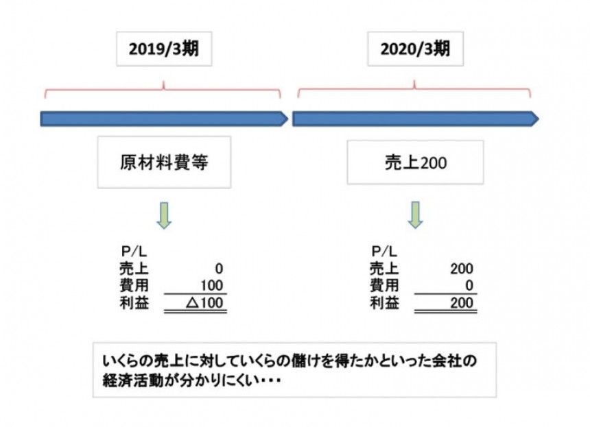 3月決算の会社が、2019年3月中に、原材料、人件費、製造に係る諸々の経費を合計100使って製品を製造したとします。これらの費用は既に発生しているので、発生主義によれば2019年3月期に100の費用が認識されます。一方、製品は翌月の4月に200で販売されるとすると、売上200は実現主義により翌期2020年3月期の4月に計上されます。つまり、費用と収益の計上時期が乖離、泣き別れが生じます。