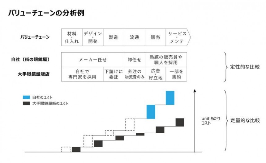 多くのビジネスパーソンがバリューチェーン分析を行って最初に目が行くのは、実際にかかっているコストです。そのコストが最終的に顧客が支払う対価に見合っているなら問題はないですが、顧客が支払う対価に見合っていない、あるいは競合に比べ高くなっている場合、そのコストをカットしよう、あるいは何らかの方法で生産性を高めようという動きにつながることが多くなります。たとえば新製品の開発数が他社に比べて劣っているのに研究者数が多いなら、オープンイノベーションを進めて研究者を他部署に配転する、あるいは営業担当者の人数は多いのに生産性が低いなら、SFA(セールスフォースオートメーション)を導入して営業の効率を上げようなどです。