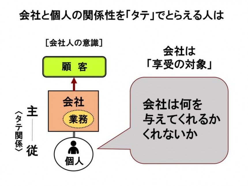 会社と自分をタテ関係でとらえる人は、会社は「享受の対象」であり、自分が我慢や忠誠を差し出す代わりに、会社は何を与えてくれるか、くれないかという意識になります。そのために、キャリア形成も外的ファクター、なかんずく、会社の制度・風土・待遇条件次第だ、という考え方に傾斜していきます。