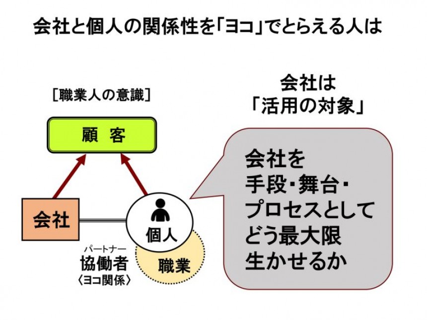 他方、右側は、会社と自分が「協働者(パートナー)関係」ととらえるイメージです。会社も自分も独立した存在である。自分はしっかりと自身の職業を携える――すなわち、社内外で通用するスキルを醸成し、どこからも雇われる実力を有する――存在であり、会社はそうした人材を生かす機会を提供する存在である。双方が協働することで事業が回っていく。そんなヨコの関係性です。