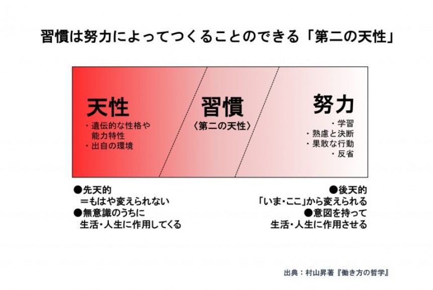 習慣は下図のように天性と努力の中間に位置し、両方の性質を持つことが重要な点です。つまり、習慣は努力の一部、技術の一部ですから、意志を持って取り組めば、自分の性向や態度、姿勢をそう仕向けることが可能です。そこには、まったく新しい第二の天性を後天的につくることができるという希望があります。