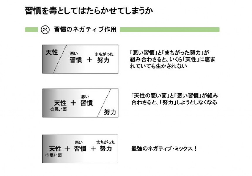 ただ、習慣には「よい習慣」と「悪い習慣」があります。よい習慣は自分の生活に薬として効いてきますが、悪い習慣は毒として作用します。それほどに日々の振る舞いの地盤は重要なものです。