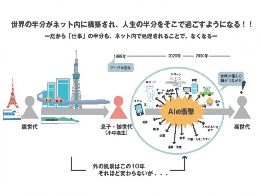 皆さんには言わずと知れたことだと思いますが、今はネットワーク社会から超ネットワーク社会に移行しつつあります。たとえば、昔は大きな建物を建てることを建設と言っていたし、工事もそういう建物のイメージですよね。でも、今は都市の半分以上と、その都市で使うサービスがネットのなかに建設されています。そのなかで、AI・ロボット社会になるというのは言わずもがなでしょう。でも、僕はもっとすごいと思うことがあります。これからの10年間における最大の変化というのは、世界中の50億人、人口の半分以上がスマホでつながっちゃうことなんですよね。脳のイメージが共有される。つまり50億人の脳が擬似的につながって、そこにAI武装したロボットもつながってくる。これが超ネットワーク社会の実態だと思うんです。