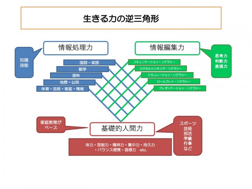 で、そのときにすごく大事な力が、次にプレゼンする情報の編集力になります。僕の本にもさんざん出てくる「生きる力の逆三角形」という図をお見せしますね。